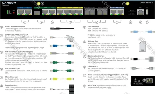 - 2x RJ-45 (modem connection), 2x Gb WAN (1x shared with SFP WAN), 1x SFP (shared with RJ-45 WAN), 4x Gb LAN, 4x Phone analog, 2x ISDN, 1x RJ-45 management (serial), 1x USB-A management