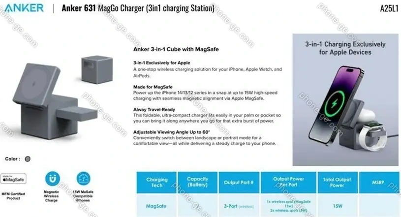 - 1x беспроводная зарядка (MagSafe, 15W), 1x беспроводная зарядка (Apple AirPods, 5W), 1x беспроводная зарядка (Apple Watch, 5W)