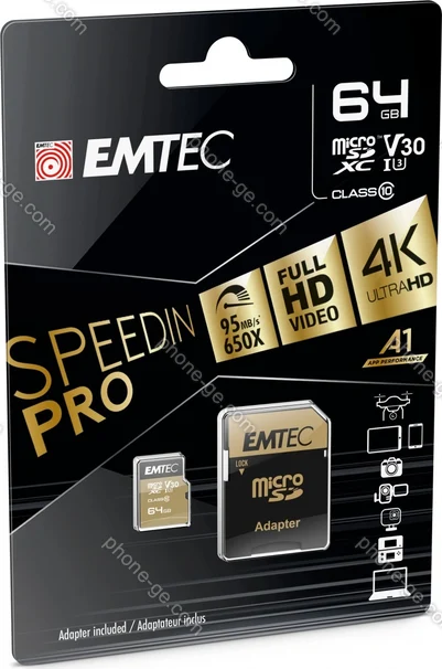 Карта памяти Emtec SpeedIN PRO R95/W85 microSDXC 64GB Kit, UHS-I U3, A1, Class 10 — купить в интернет-магазине в Тбилиси с бесплатной доставкой по Грузии