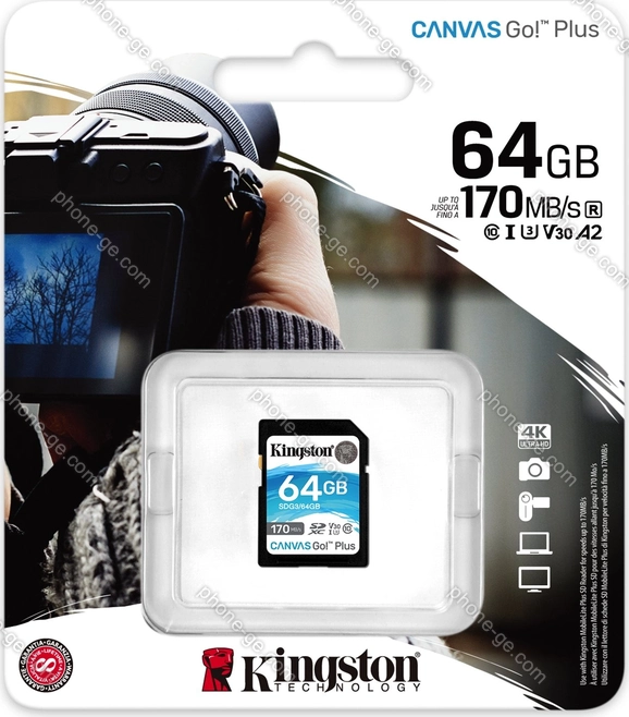 Карта памяти Kingston Canvas Go! Plus R170/W70 SDXC 64GB, UHS-I U3, Class 10 — купить в интернет-магазине в Тбилиси с бесплатной доставкой по Грузии