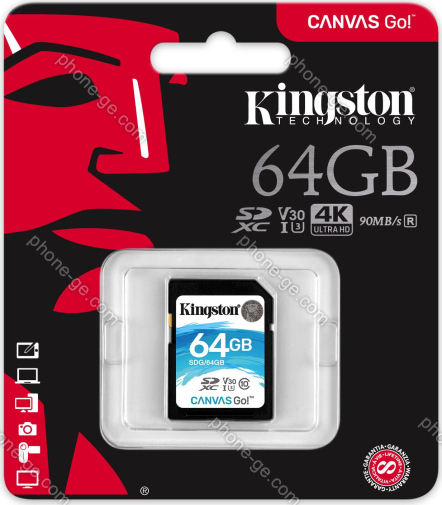 Карта памяти Kingston Canvas Go! R90/W45 SDXC 64GB, UHS-I U3, Class 10 (SDG/64GB) — купить в интернет-магазине в Тбилиси с бесплатной доставкой по Грузии