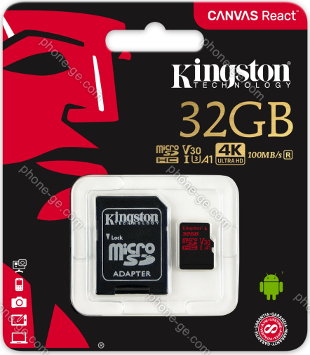 Карта памяти Kingston Canvas React R100/W70 microSDHC 32GB Kit, UHS-I U3, A1, Class 10 (SDCR/32GB) — купить в интернет-магазине в Тбилиси с бесплатной доставкой по Грузии