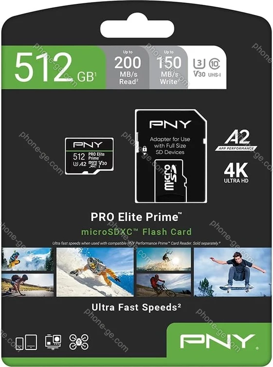 Карта памяти PNY Pro Elite Prime R200/W150 microSDXC 512GB Kit, UHS-I U3, A2, Class 10 — купить в интернет-магазине в Тбилиси с бесплатной доставкой по Грузии
